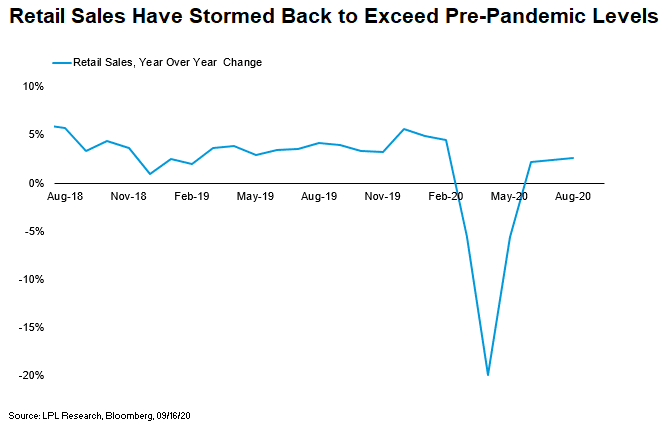 8月销售较上月增长0.6%,而Bloomberg的一致预期为增长1%。此前7月为0.9%。剔除建材、汽车和天然气的控制组下降0.1%,也未达到预期(US Census Bureau)。虽然在重要的返校购物季期间零售业也没有那么好,但往好处想,零售销售仅用了5个月就恢复到了疫情前的水平,而2008-09年金融危机期间则花费了40个月。