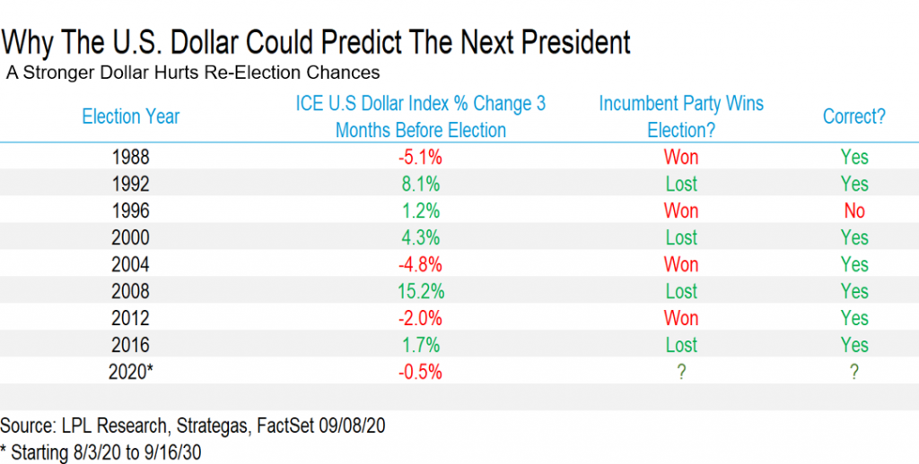美元在大选前的表现一直是衡量哪方可能在11月获胜的重要指标。如果美元在大选前三个月表现疲软,那么连任将有望,但如果美元走强,连任则很难。在过去的8次选举中,这个信号有7次是正确的。