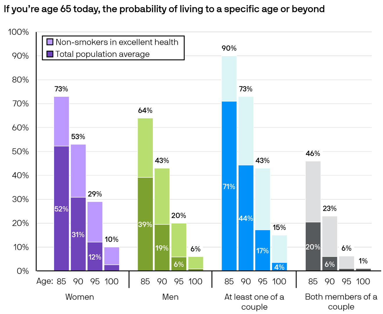 在很多人看来,整个退休规划的核心,是怎么给自己造一个退休工资单,一个每个月都准时到账,而且能陪你走到人生终点的稳定收入。为啥这事儿这么重要?答案很简单,因为咱们现在活得是越来越长了。我们看看JP Morgan的这个研究,一对65岁的健康夫妻,两人里头至少有一个能活到90岁的几率高达73%,活到85岁的可能性高达90%。