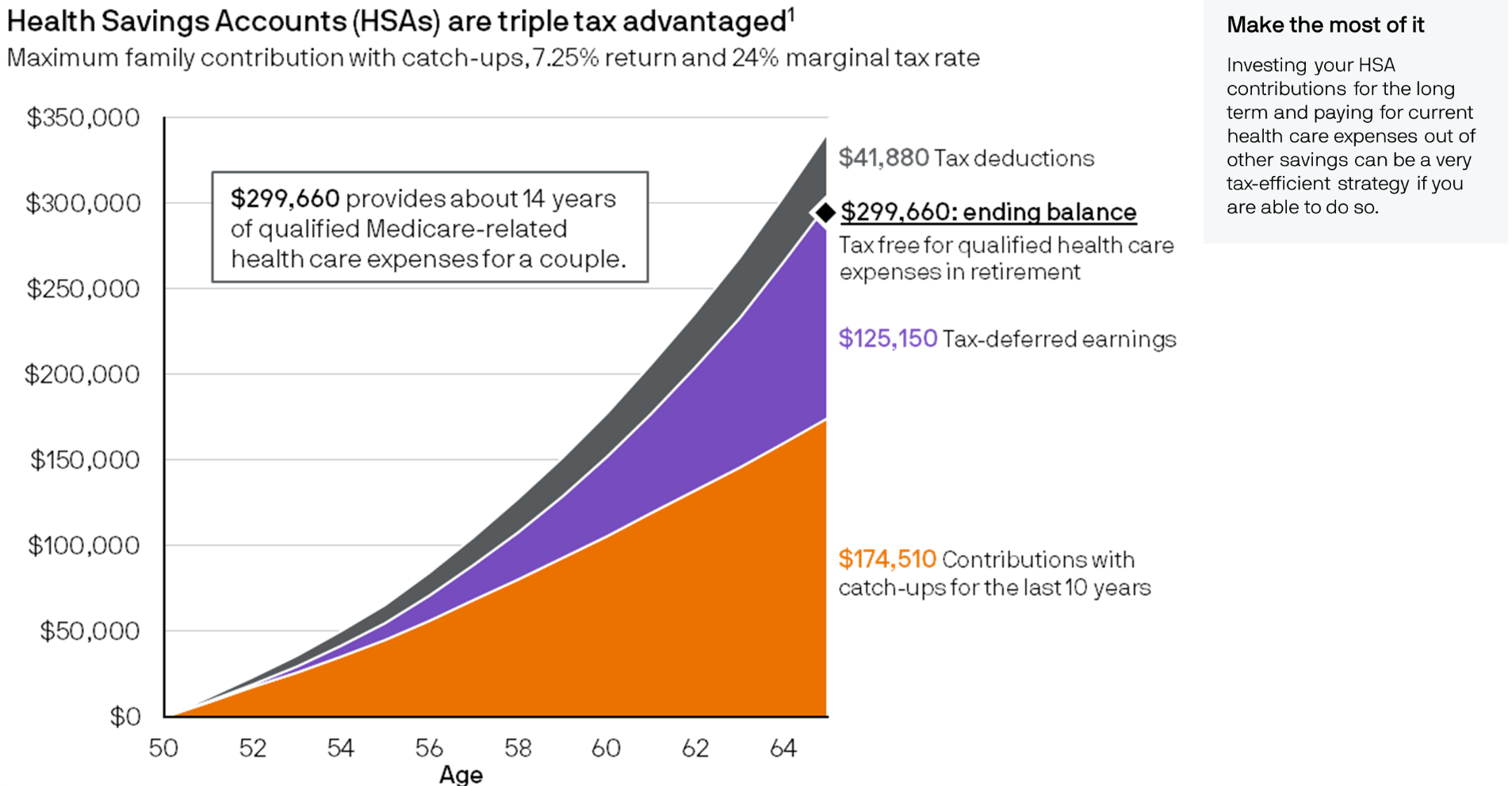 根据JP Morgan的模型,一对夫妻从50岁开始,未来15年每年存满HSA账户(记得满55岁后每个人都可以存catch up),按7.5%的增值,到65岁时账户里会有约30万。这些钱基本够这对夫妻未来15年的医疗费了。