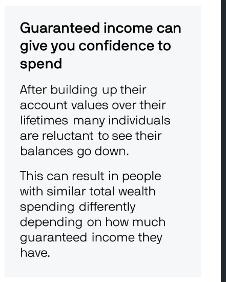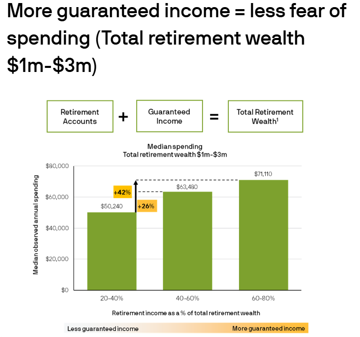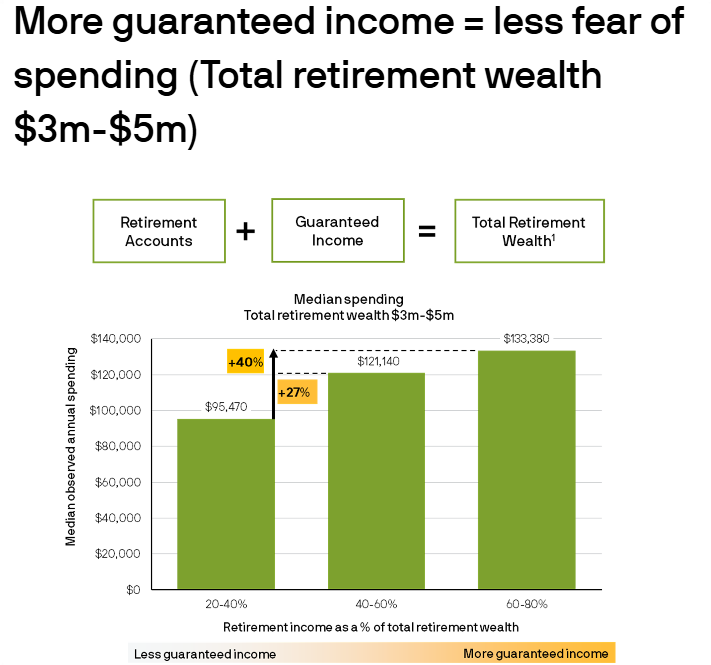 JP Morgan做了个研究,发现了一个有趣的现象。他们对比了保证收入占比不同的退休家庭们。什么是保证收入占比呢?就是社安金加上pension加上年金,这些你每月固定能领到的钱,占你总退休资产的多少。研究发现,保证收入占比越高的家庭,反而更敢花钱。保证收入占比中等的家庭比占比低的,每年平均多享受27%的生活支出。保证收入占比高的更夸张,平均多享受42%的生活支出。
